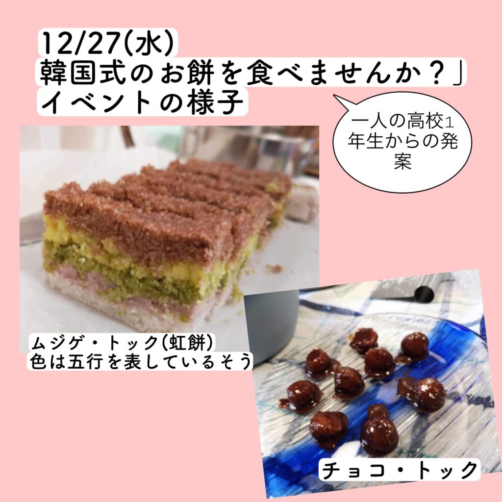 12月27日は、ゆ~くる開所、年末最終日。この日は、一人の高校1年生の発案で、「韓国式のお餅をたべませんか?」というイベントを開催しました。