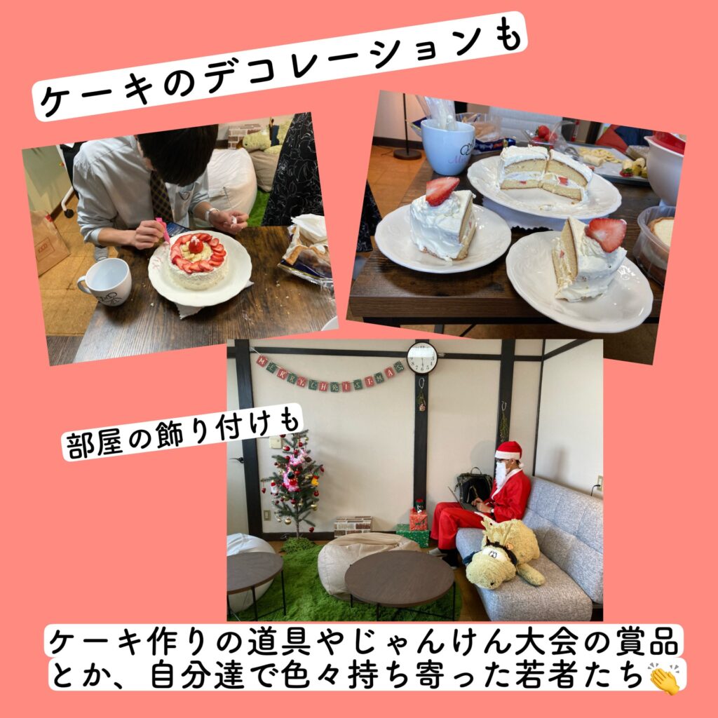 さっそくケーキ作りがはじまり、デコレーション。チキンのいい香り。